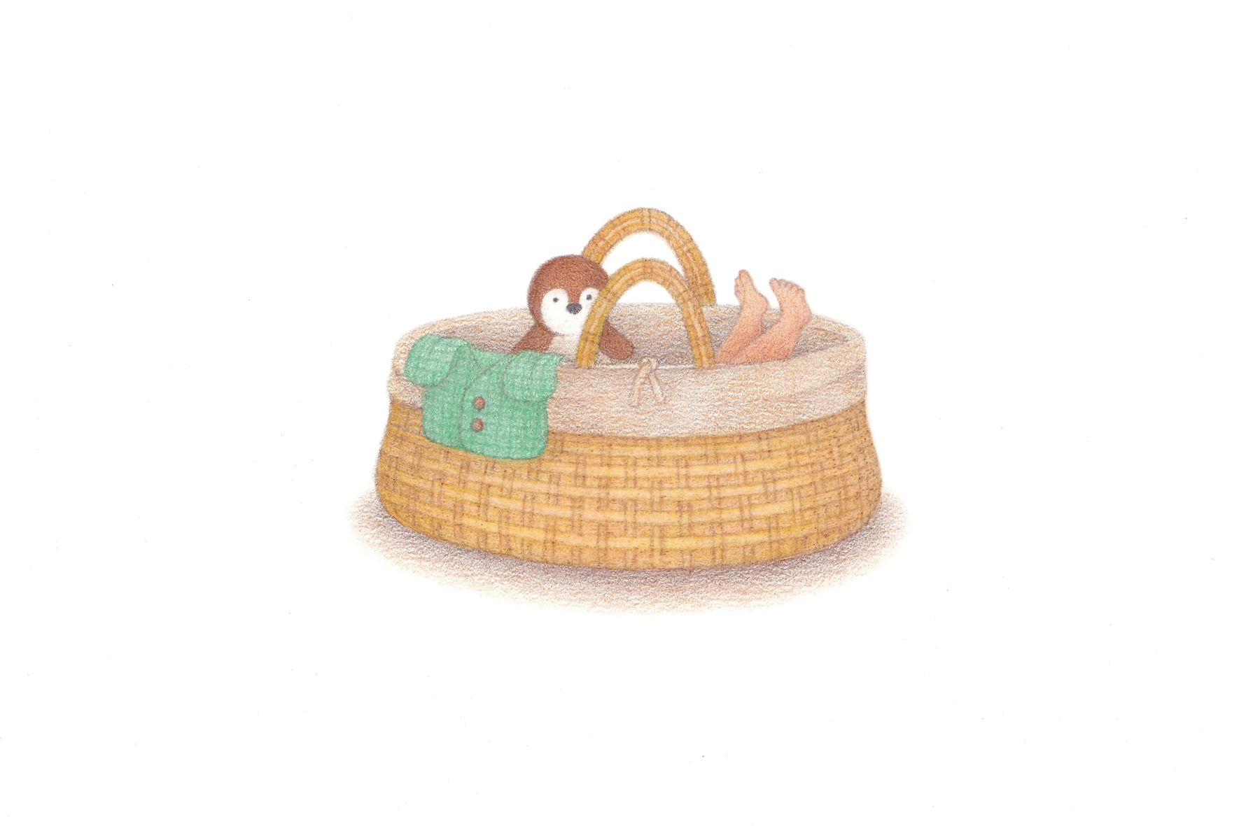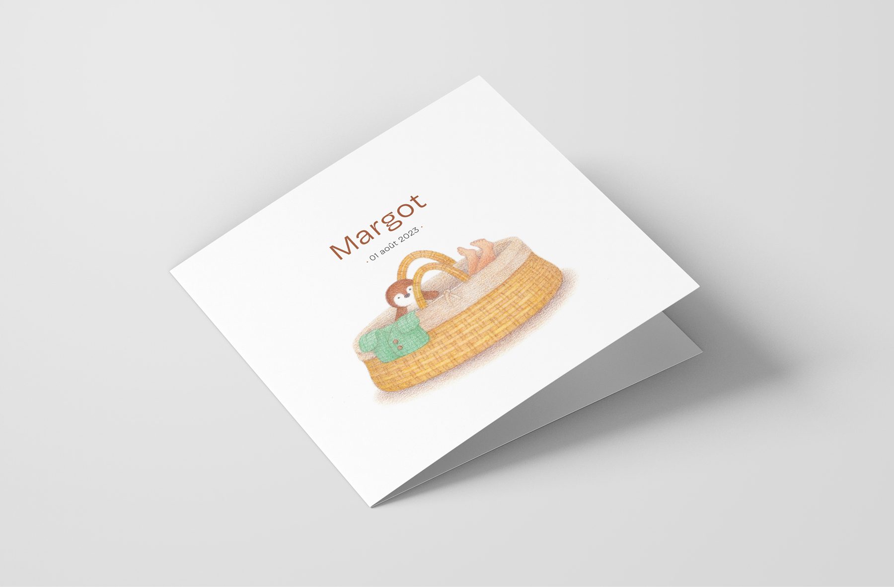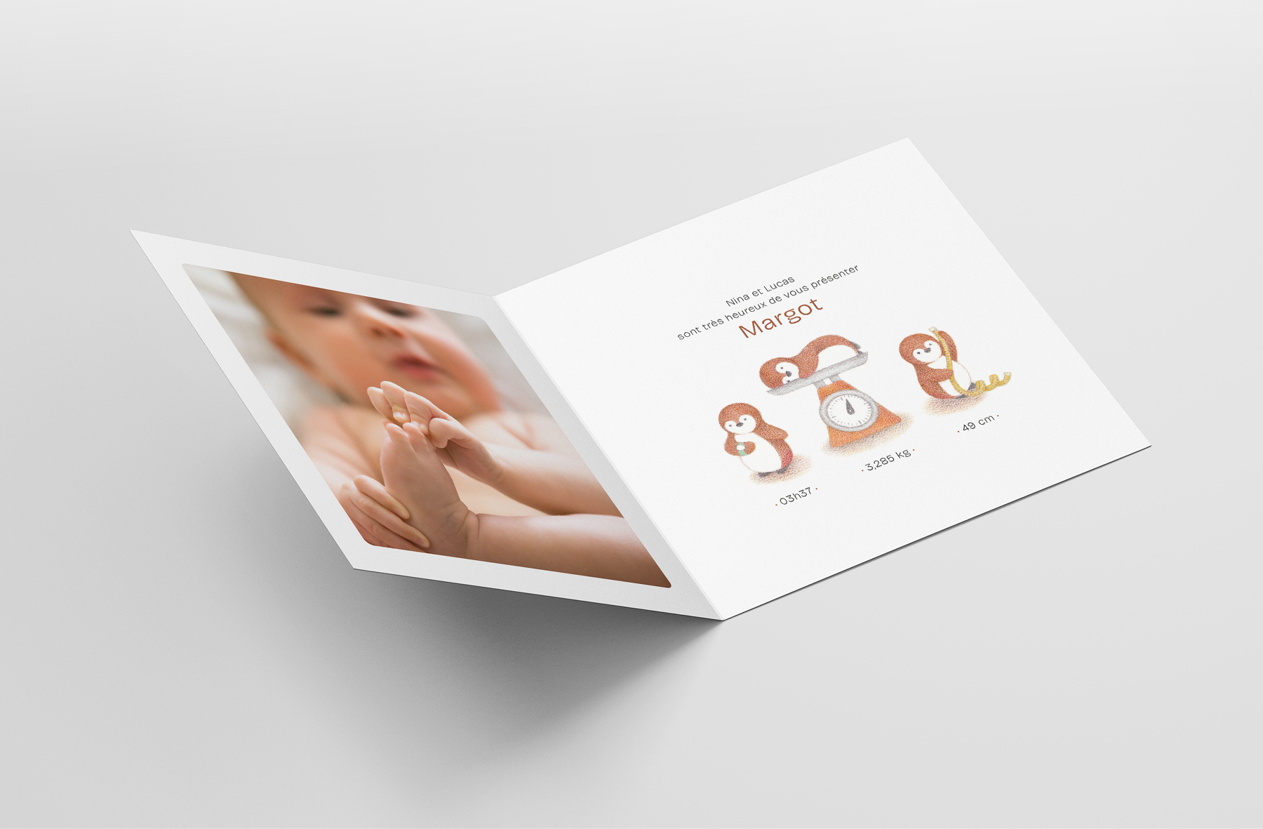 Faire-part de naissance ponctué de clins d’œil personnalisés, du berceau en osier au gilet tricoté, jusqu’à la peluche de pingouin utilisée comme fil narratif.